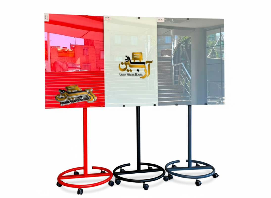 تخته وایت برد شیشه ای رنگی به همراه پایه نگهدارنده چرخدار