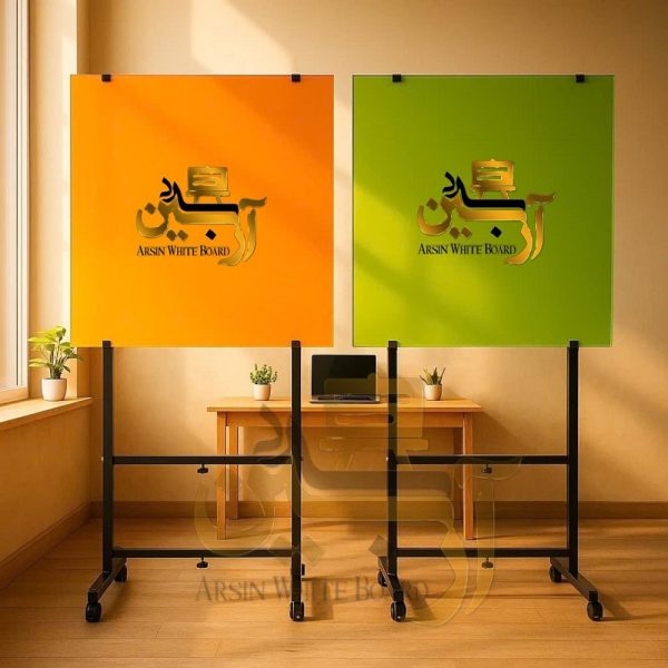 تخته وایت برد شیشه ای رنگی به همراه پایه نگهدارنده چرخدار